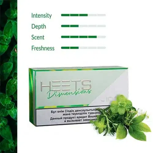 Heets Ammil Dimensions. An exceptional blend of fresh and herbal notes accompanied by an underlying twist of velvety and creamy sensations.
