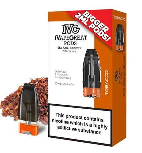 IVG Prefilled Pod, prefilled pods from I VAPE GREAT in 4 Great flavors ICED BERRY LEMONADE, BLUE RASPBERRY ICE, MANGO, and TOBACCO.