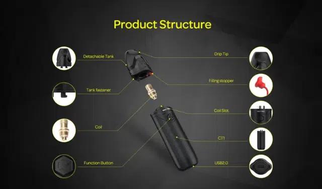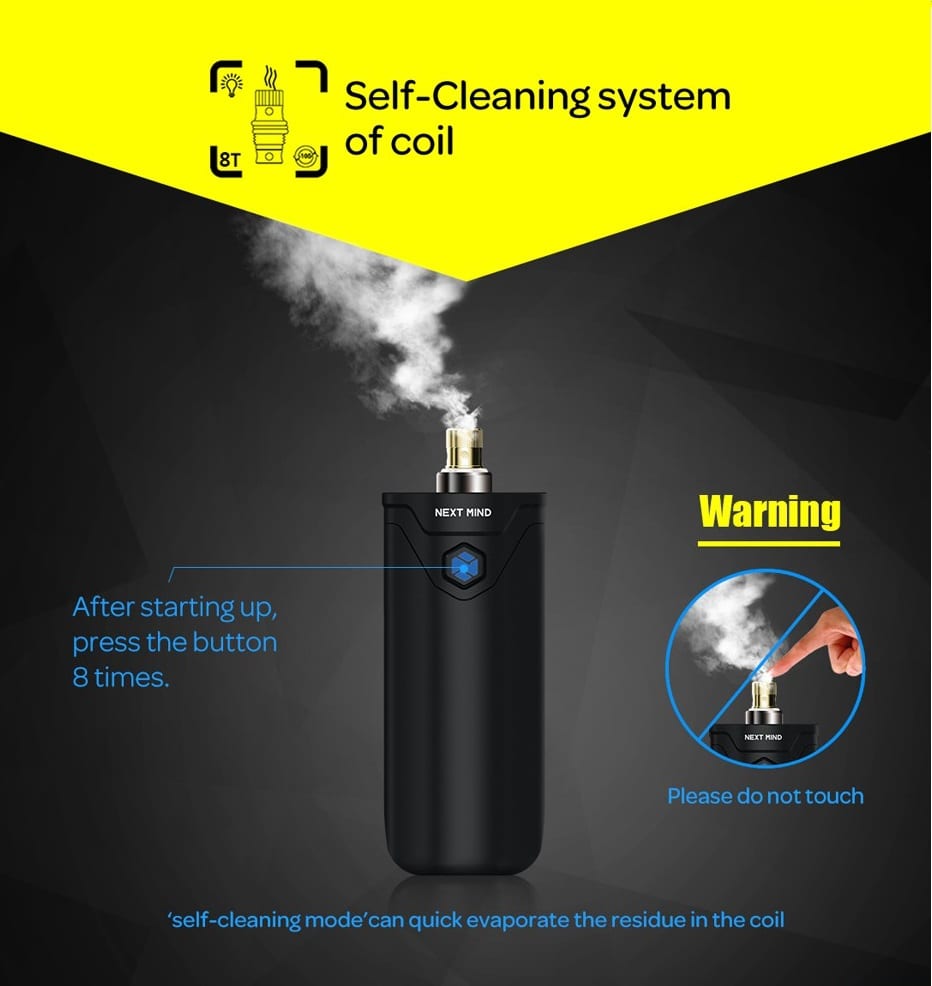 These coil heads threaded onto the CT1 that then inserted into the refillable pod. The CT1 automatically adjusts power output from 10 to 17W in order to adapt to the type of coil head installed. The self-cleaning mechanism activated with eight successive button presses and activates a 10-second dry burning feature. This feature should be used with the pod system removed from the body of the device. The Next Mind CT1 Pod System is a unique device with extremely convenient features that allow quick flavor switching and a battery to last all day.