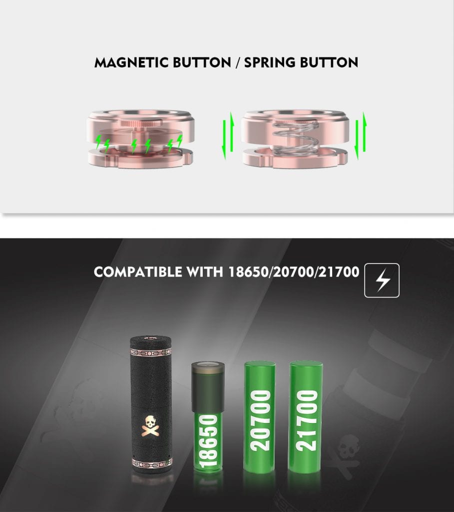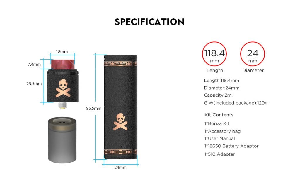 VandyVape Bonza Kit Mod. A portable pen-style kit, which combines a Bonza mechanical mod with a Bonza V1.5 RDA. It is powered by a single 21700/20700/18650 battery. The Bonza mech mod utilizes pure copper to conduct electricity, it can reduce internal loss. It also comes with an insulator ring and insulator tube to ensure safety. The kit includes a magnetic button and a spring button to satisfy your preference. In addition, each mech mod has an individual number. The Bonza V1.5 RDA features an advanced airflow system to achieve intense clouds and flavor. The improved build deck is easier to build. In addition, The Bonza Kit adopts an interchangeable sleeve system for customization and logo alignment. Therefore, you must own one.
